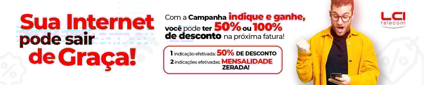 2 Indicações efetivas: Sua fatura é ZERADA! Imagine ter uma internet ultraveloz e passar o mês sem pagar nada! Não perca essa chance! Comece a indicar agora e garanta essa super vantagem com a LCI!